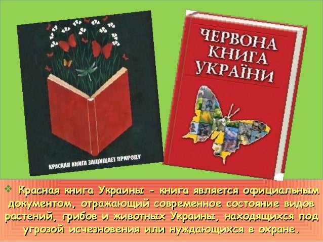 | Червона книга України — основний документ, в якому узагальнено матеріали про сучасний стан рідкісних і таких, що знаходяться під загрозою зникнення, видів тварин і рослин, на підставі якого розробляються наукові і практичні заходи, спрямовані на їх охорону, відтворення і раціональне використання. |